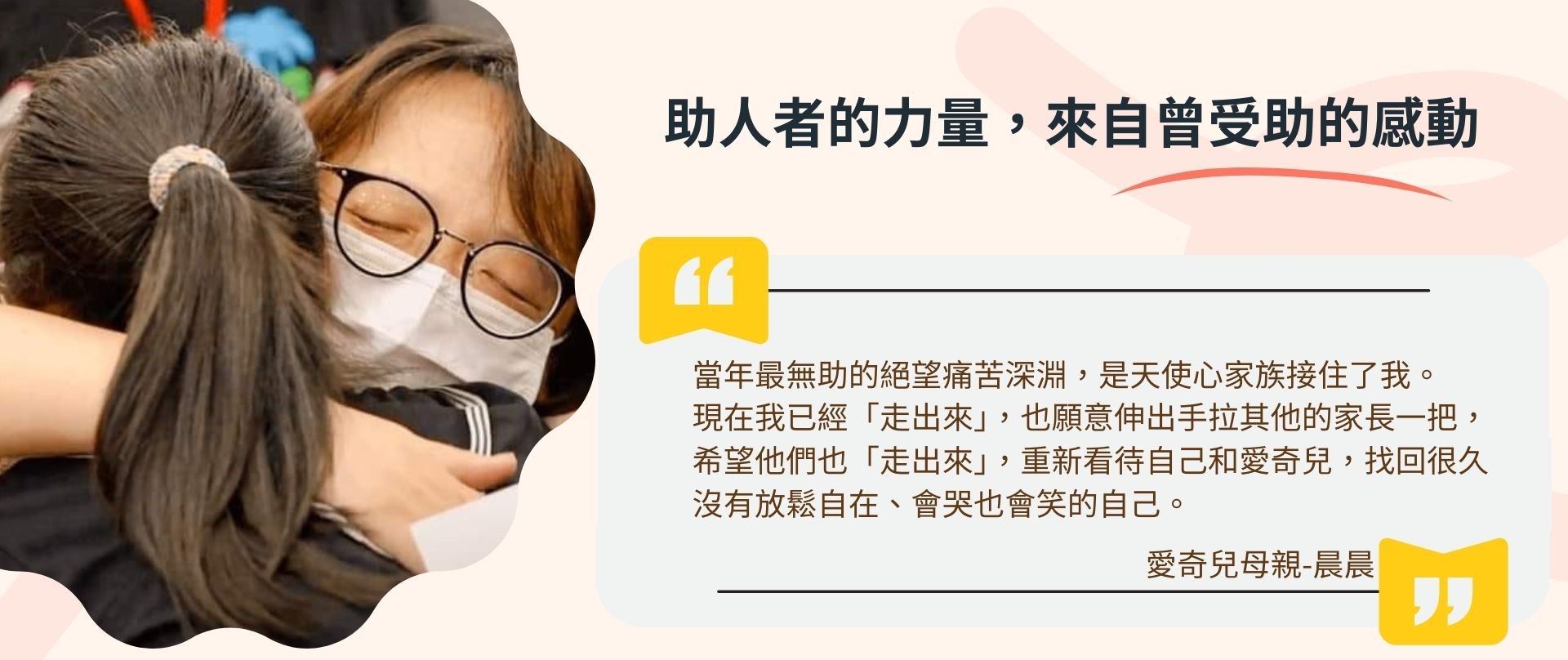 愛奇兒家庭內心最大的苦,是因為困難不被理解,而說不出口,無法獲得幫助。天使心家族服務過的家庭在專業服務的溫柔陪伴中,終於放下永遠沒有答案的「為什麼」,帶著摯愛的孩子繼續前行生命旅途。