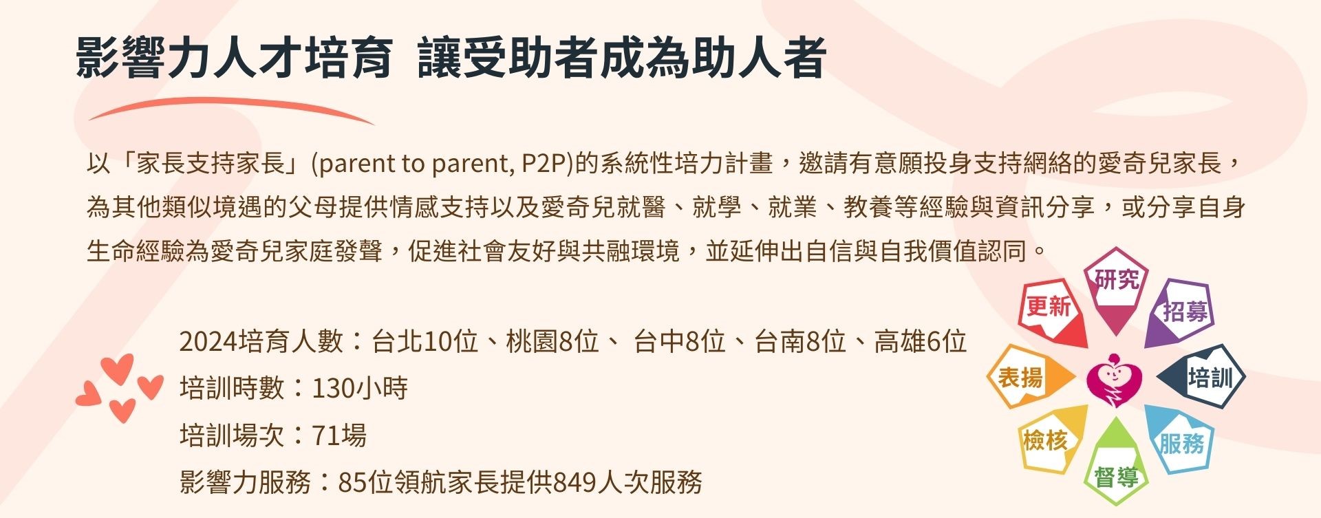 影響力人才培育計畫2024年度總經費共819,100元,包含71場、共130小時的專業培訓;補貼領航家長前往服務的車馬費;以及服務經驗交流聚會與成果發表會。愛奇兒家庭影響力人才培育計畫募款需求