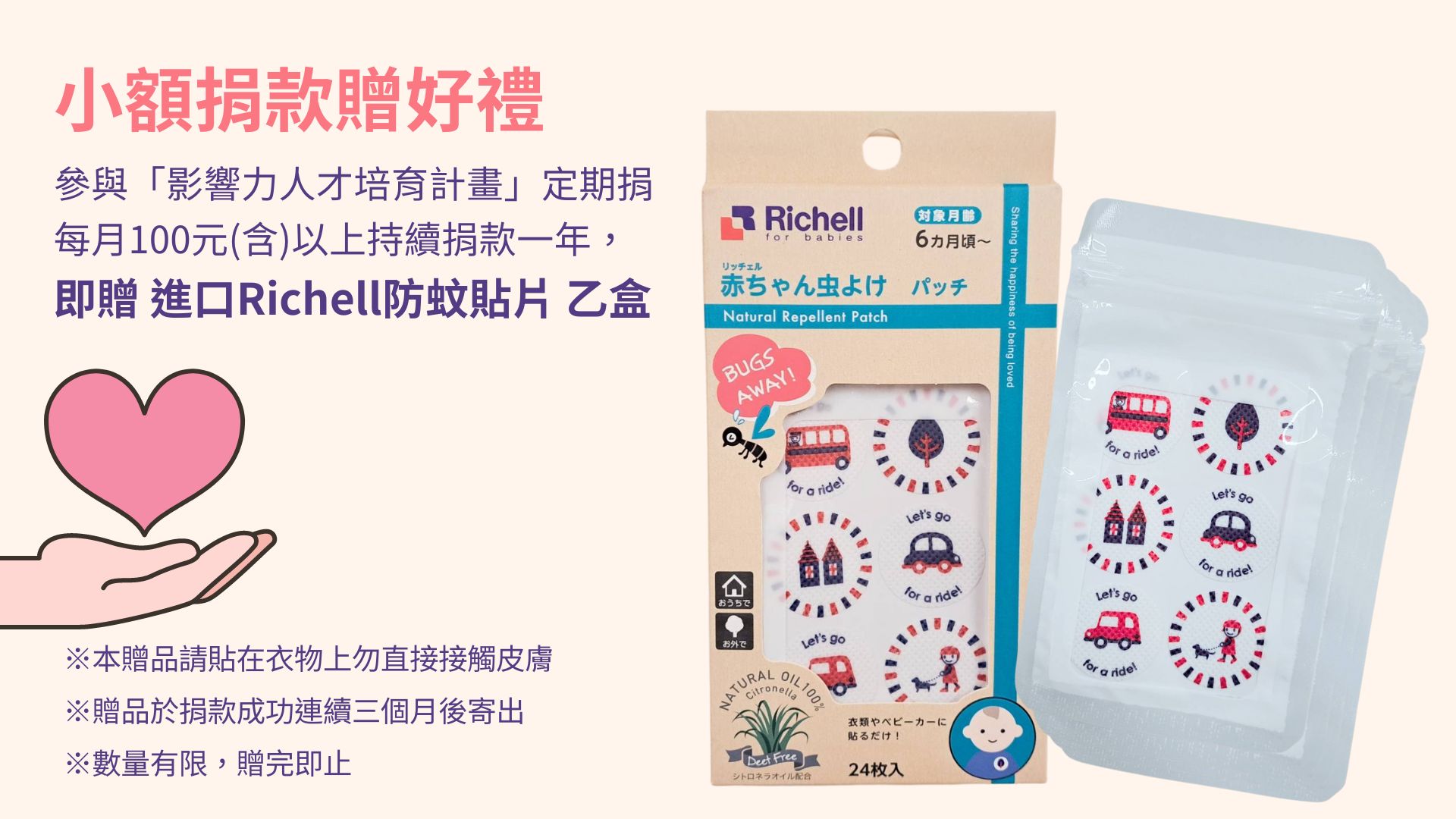 參與天使心家族「影響力人才培育計畫」定期捐,每月捐款金額100元以上,一年以上即贈 「進口Richell防蚊貼片」 乙盒!(數量有限,贈完即止)