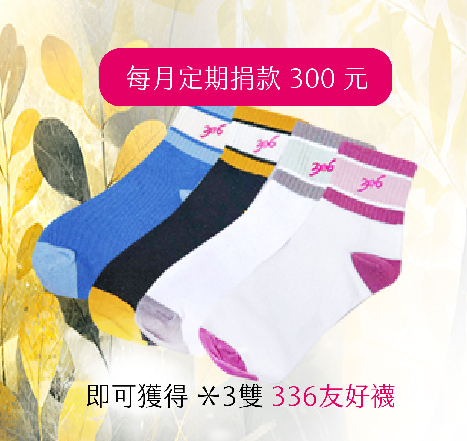 ▲指定捐款支持【愛奇兒家庭服務】計畫,定期定額捐款每月 300 元(含)以上持續一年,即可獲得【336 友好襪】3 雙 (隨機不挑色)。數量有限,贈完即止!