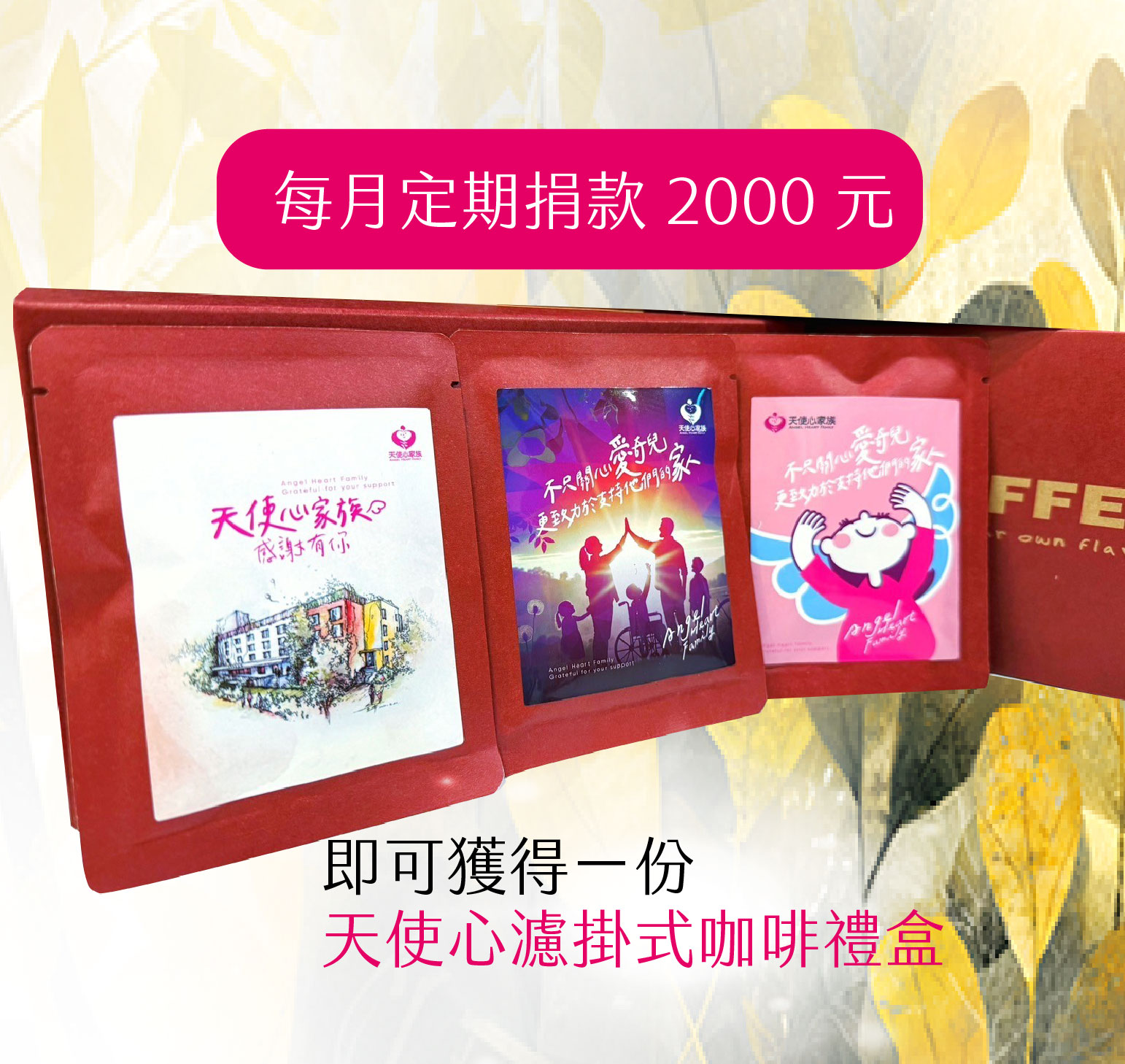 ▲指定捐款支持【愛奇兒家庭服務】計畫,單筆 24,000 或定期定額捐款每月 2,000 元(含)以上持續一年,即可獲得【天使心濾掛式咖啡禮盒】乙份。數量有限,贈完即止!